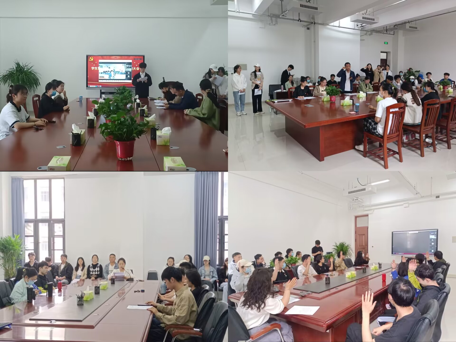会议严格按照党组织所规定的预备党员接收、转正、党支部委员换届选举的规定及程序进行。大会伊始,各发展对象逐一宣读《入党志愿书》,并向党组织汇报自身入党动机、个人经历以及在校表现等,随后由各支部组织委员及宣传委员介绍各自发展对象现实表现考察以及综合政治审查情况,对发展对象是否符合党员条件发表意见。经与会正式党员举手投票表决,大会一致同意接收王勃等30名同志成为中共预备党员。随后,各支部预备党员逐一宣读《转正申请书》,并陈述个人的基本情况,由各支部组织委员、宣传委员介绍各预备党员在预备期间的表现,并发表个人意见。经与会党员投票表决,支部党员一致同意白聆钰等39名同志符合共产党员的基本条件,如期转为中共正式党员。紧接着,各党支部开展支部委员换届选举工作,各参选人汇报个人发展历程、工作经验及未来工作展望,经党支部党员投票表决,选举王晨羽等6名同志为新一届支部委员。会议最后,各党支部书记对与会成员作出要求,希望各预备党员积极向优秀共产党员学习并树立先锋模范作用,争取早日正式加入中国共产党;希望新党员能够不忘初心跟党走,在今后的学习工作中,坚定目标、严格要求自身,努力改正自身不足。