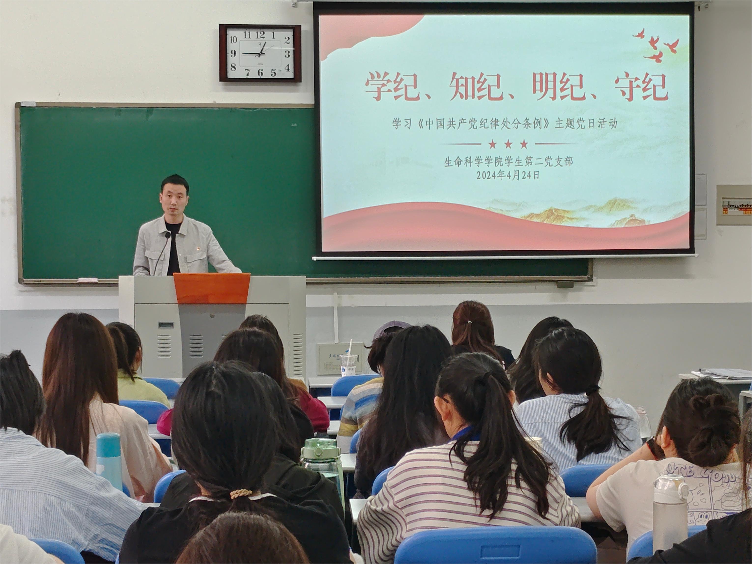 学生第二党支部开展了“学纪、知纪、明纪、守纪”主题党日活动。支部书记张琨围绕《通知》要求,结合支部党员实际,指出学习《条例》时要紧扣党的政治纪律、组织纪律、廉洁纪律、群众纪律、工作纪律、生活纪律进行学习研讨,要做到真学真悟、知行合一,要结合党纪学习教育专题强化党员自主学习,从而真正推进《条例》入脑入心。