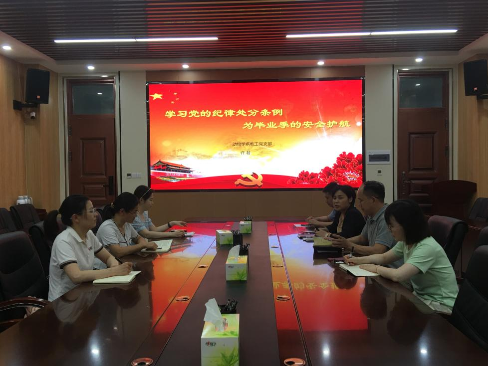 支部书记许君同志结合当前的毕业生工作重点和党的纪律处分条例,解读了第八章(对违反廉洁纪律行为的处分)和第九章(对违反群众纪律行为的处分)的主要内容和精神,强调廉洁纪律和群众纪律对于维护党的纯洁性和先进性的重要意义。从廉洁纪律角度探讨如何保障校园安全,如防止腐败行为导致的安全隐患,分析群众纪律与学生安全的联系,并结合毕业生求职、毕业设计指导、毕业生心理健康等实际案例,讲解了当前形势下,各位党员要提高思想认识,严格遵守党的纪律,提高政治站位,全心全意服务学生。全体党员认真学习了相关纪律处分条例内容,积极讨论学习心得和体会。