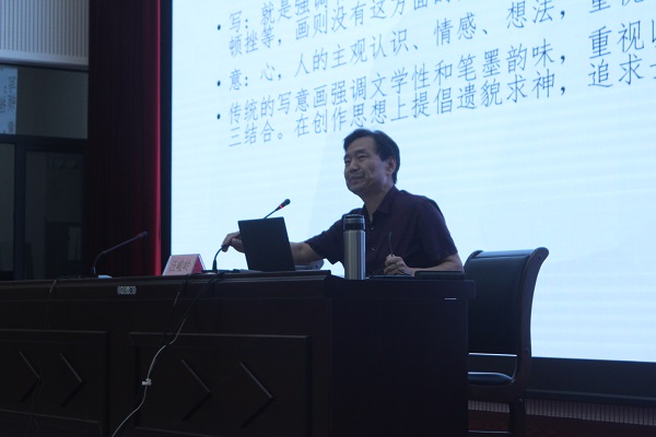 汪峻岭教授以《写意山水画美在何处》为题,围绕“写”与“意”的内涵进行深刻阐述,强调了写意画更能代表中国画的精神。中国画的评价标准包括笔墨之美、意象造型之美和意境之美,汪教授结合古今名人名画及自身经历对其一一解读。在此基础上,他还从对董其昌、黄宾虹等名家画作赏析的更深层面,向大家指明了新的文人画评判标准,同时结合作品中的不同绘画风格,强调山水画创作中的墨法和意韵写作的重要性。