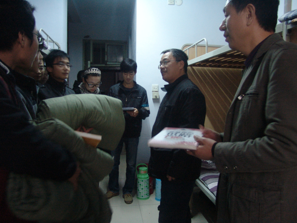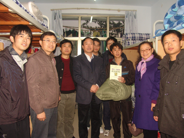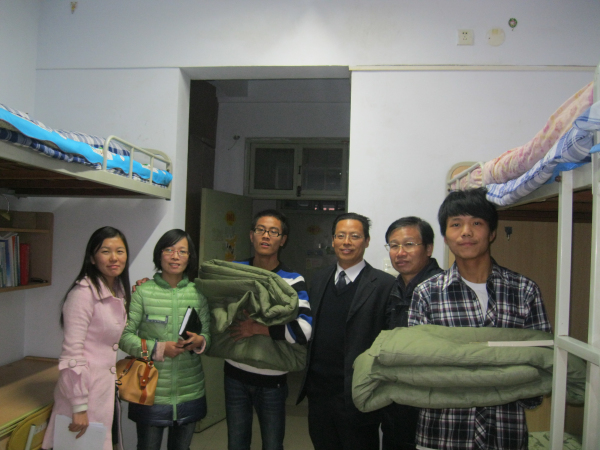 杨德东书记、夏越新处长一行人等亲切走访了受资助学生宿舍,给同学们送去了温暖的棉被和精致的书籍。活动过程中,杨书记关切的询问了学生们的生活和学习情况,告诉同学们不要有什么精神负担,一心一意搞好学习,学校会尽最大的努力帮助同学们,使同学们快乐的学习、健康的成长,最后杨书记鼓励同学们珍惜时间,刻苦钻研,争取更大的进步。活动期间,其他领导和班主任老师也都表达了自己对同学们的热切关心和殷切希望。