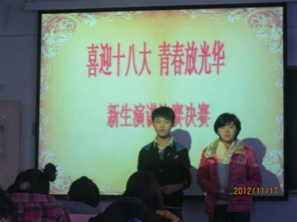 在党的十八大胜利召开的背景下。为了充分表达大学生对时事的关注,也为了提高同学们的口才。学习部于2012年11月17日14点在推广楼410隆重举行了以“喜迎十八大,青春放光华”为主题的新生演讲比赛。