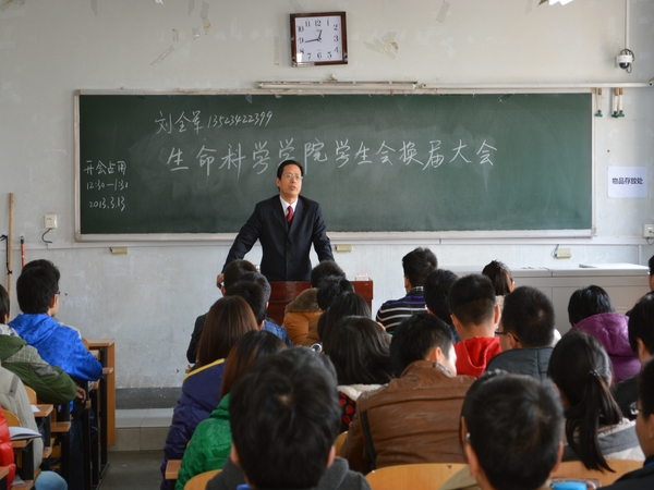 在校本部3#318教室举行学生会换届大会,出席大会的有院党委副书记刘全军、院团委副书记雷雯、辅导员魏圆圆,院第八届学生会主要成员和第九届学生会全体成员参加大会,大会由院团委书记程城主持。