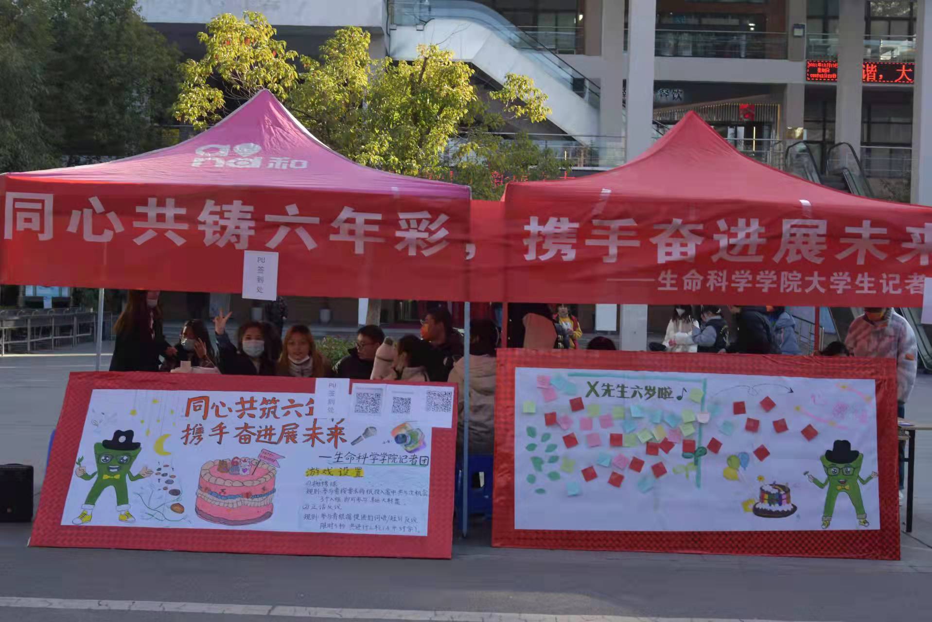 此次周年庆以“同心共铸六年彩,携手奋进展未来”为主题,由院记者团主办,活动面向全校师生,有线上和线下两种方式。线上参与活动者,凭转发杏吧原创 官方QQ、微信、微博活动预热推文的集赞数或抽奖结果兑换奖品。线下活动由趣味小游戏“抛绣球”、“幸运大转盘”、留言板等部分组成,参与者完成挑战即可现场抽取奖品。穿着玩偶服的“X先生”活跃在现场,吸引同学们驻足围观互动,现场气氛热烈。此次活动在同学们真挚的祝福留言中圆满结束。