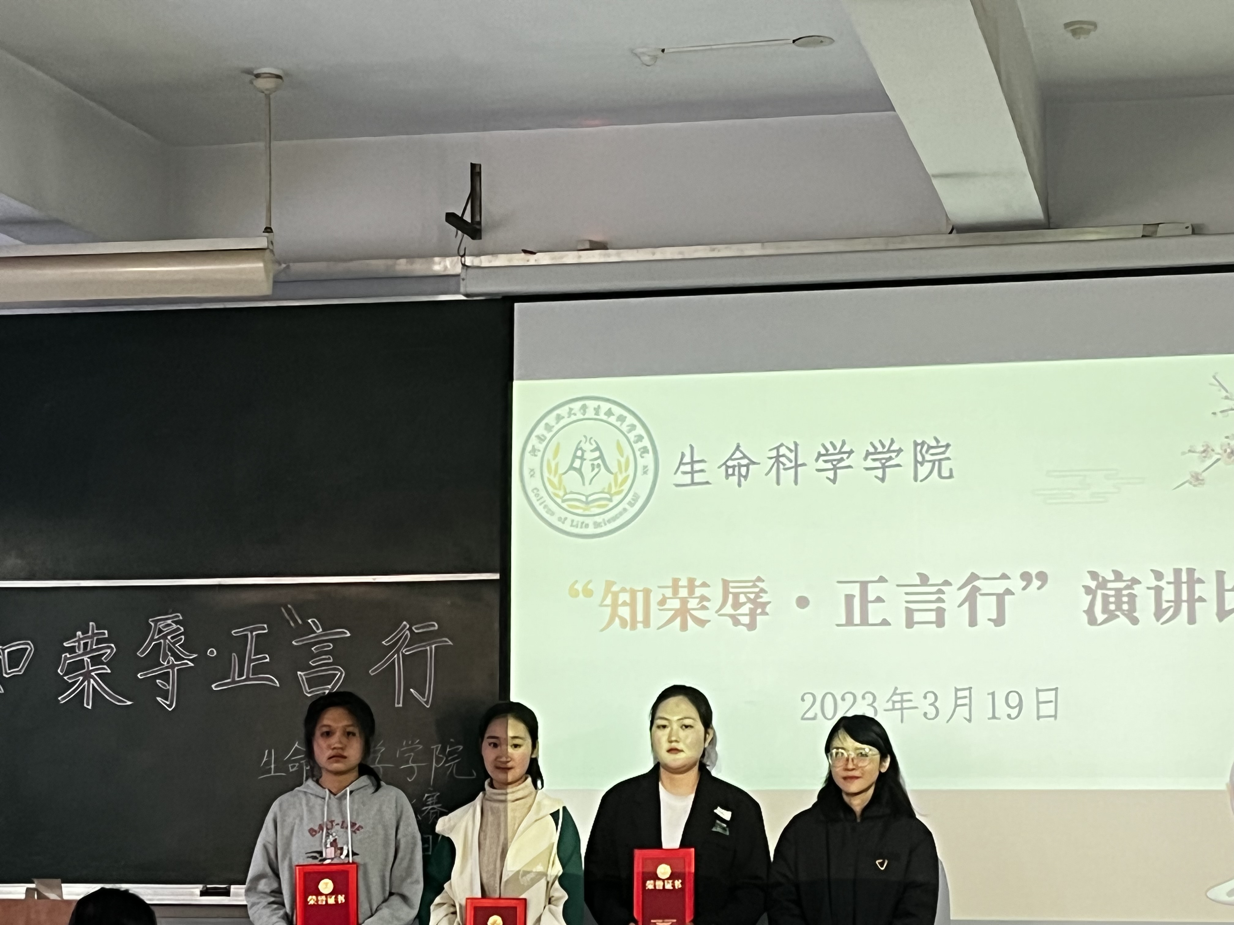 经过预赛遴选,本次决赛共有八位选手入围,各位参赛同学各具特色、仪表端庄、语言流畅,紧扣“知荣辱·正言行”这一主题,有的以过往为镜剖析自我,有的以先贤为例规范自我,有的以道德信仰为标展望自我,充分展现了当代青年大学生厚德端行的精神风貌和文明修身的信念决心。现场评委本着公开、公平、公正的原则,结合参赛选手的语言组织能力、语言应用能力、舞台表现力三方面,对每位参赛选手进行打分,其中,22级生物工程三班车文瑞摘得桂冠、22级生物科学类七班陈思源荣获亚军、22级生物工程四班单美喜得季军。最后,陈子璇为获奖同学颁奖并合影留念。至此,本次演讲比赛完美落幕。