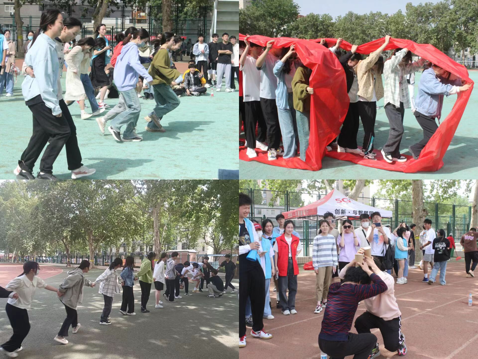 活动伊始,全体参会师生同唱国歌,接着趣味运动会正式拉开序幕。本次趣味运动会以“放飞心灵,趣动青春”为主题,包括“两人三足”、“疯狂传送带”、“疯狂躲避球”、“环环相扣”等六个趣味小游戏,旨在营造积极、团结的气氛,培养同学们的团队协作精神。比赛场上,同学们团结鼓劲、热情洋溢,趣味小游戏有序进行,吸引众多师生驻足加油喝彩。场外呐喊声、加油声此起彼伏,在一场场激烈角逐和一次次公平裁决下,各项游戏的冠亚季军陆续公布,学院老师与获奖同学合影留念,本次趣味运动会在文化路校区的赛程圆满结束。