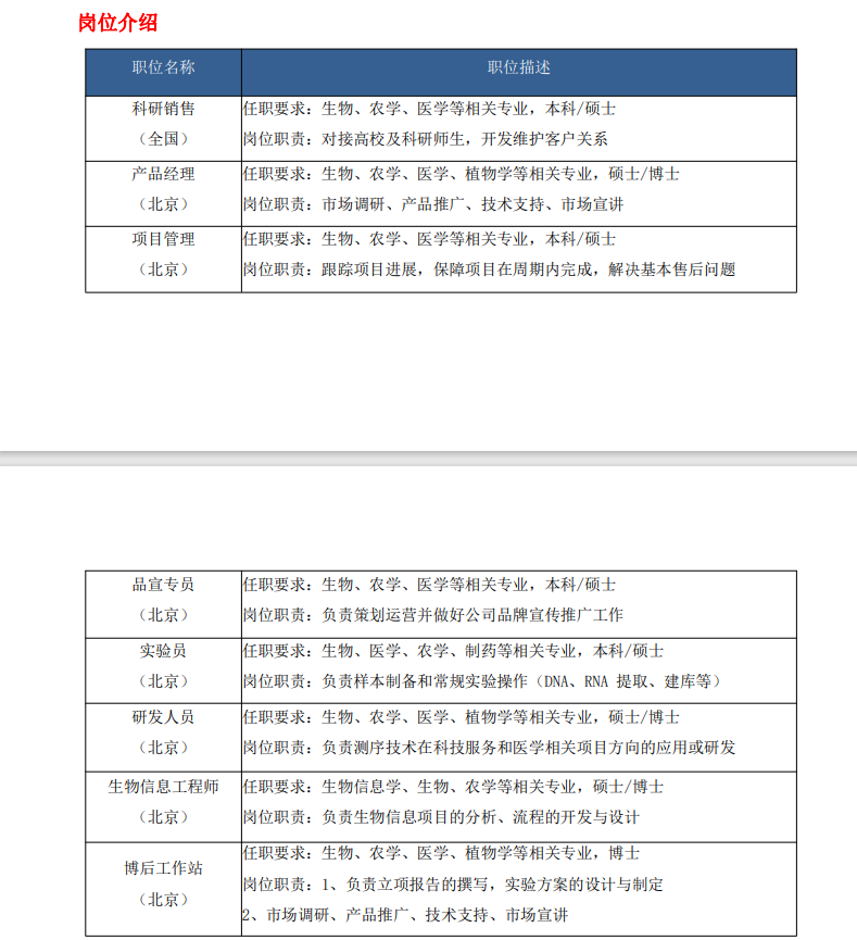 招聘科研销售、产品经理、项目管理、品宣专员、实验员、生物信息工程师等岗位,请同学们积极关注,投递简历。