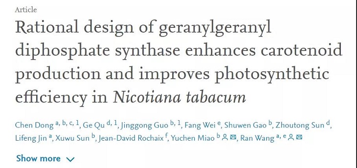 本网讯(通讯员 郑真真 王燃)近日,王燃博士和河南大学棉花生物学国家重点实验室苗雨晨团队合作,对烟草萜类物质合成的关键生物酶开展理性设计,构建了一整套基于蛋白结构的生物酶理性设计(理性设计:借助计算机和目前积累的对蛋白结构的认识去尝试设计改造蛋白质)的技术体系,填补了植物生物酶理性设计工程的研究空白,相关成果以 “Rational Design of Geranylgeranyl Diphosphate Synthase Enhances Carotenoid Production and Improves Photosynthetic Efficiency in Nicotiana tabacum” 为题,发表在 Science Bulletin 上。