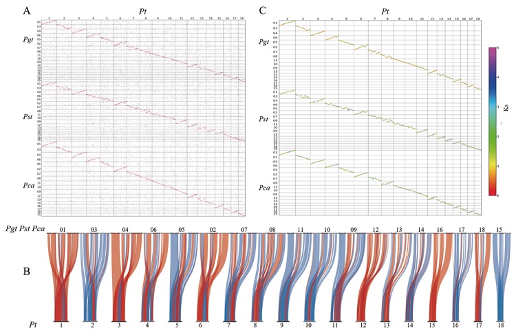 图示:基于染色体水平的基因组比较分析揭示锈菌间同源基因分布与基因共线性