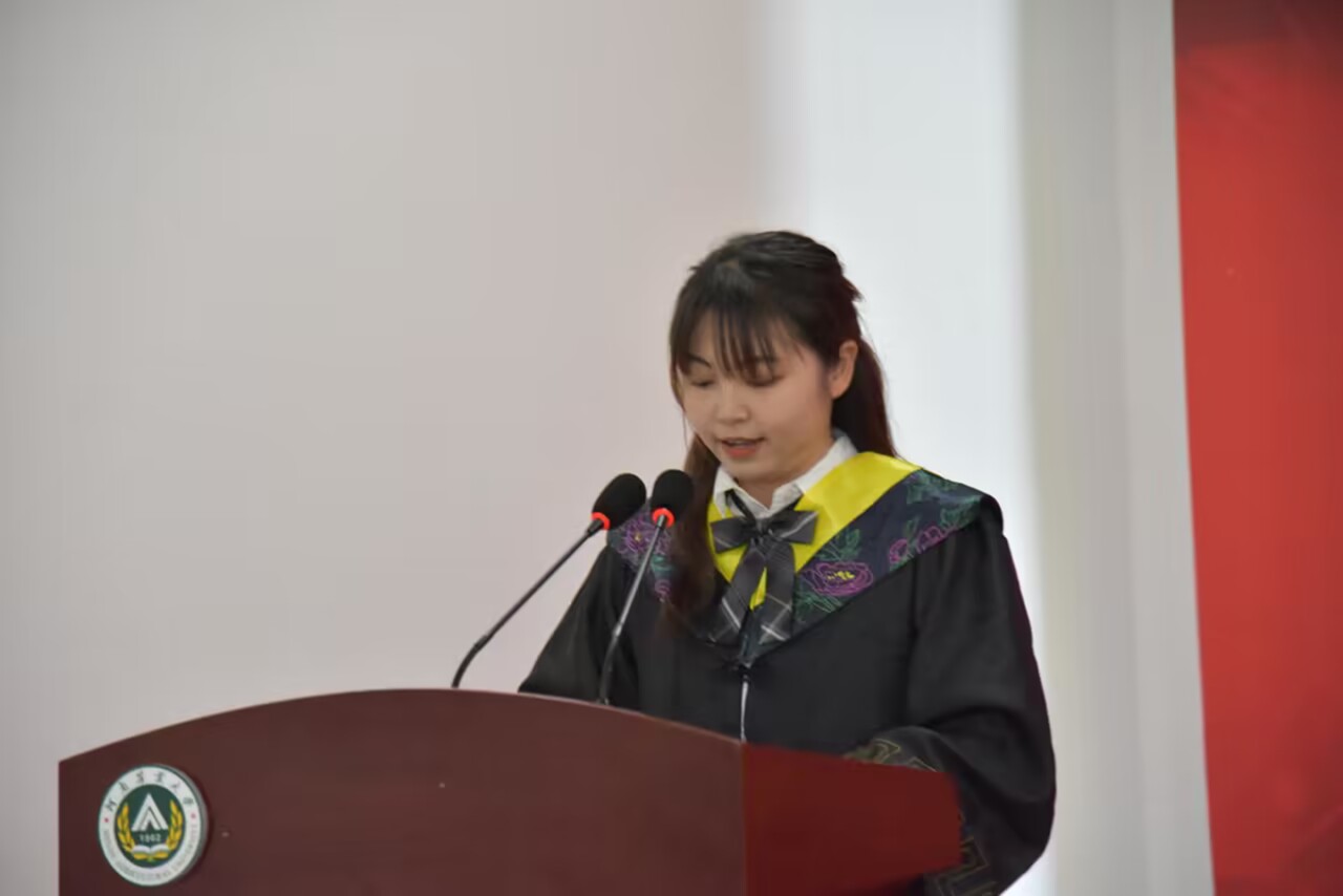 毕业研究生代表刘子豪同学发言,在农大学习生活的经历始终是他一生最可宝贵的财富和不竭的动力源泉,激励着他在平凡中坚守初心、砥砺奋进。他希望毕业生们坚持梦想、不忘初心,注重细节、精益求精,勇挑重担、心怀家国。历经坎坷,耐得住平凡寂寞,收获成功,亦能够永葆初心。最后他号召全体毕业生:“让我们相约下一个十年、二十年校庆再相见时,以优异的成绩骄傲地向母校报告!”