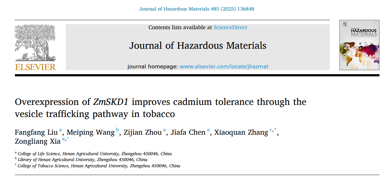 2024年12月12日,杏吧原创 夏宗良教授课题组在读博士生刘芳芳(第一作者)在国际著名学术期刊《Journal of Hazardous Materials》(中科院一区TOP期刊,IF:12.2)在线发表了题为“Overexpression of ZmSKD1 improves cadmium tolerance through the vesicle trafficking pathway in tobacco”的研究论文。这是继今年1月和9月之后,该课题组研究生以第一作者在《Journal of Hazardous Materials》连续发表的第三篇高水平论文。三项创新性成果的发表,集中展示了该课题组在作物抗镉污染关键基因挖掘与调控机理研究领域取得的重要进展,助力作物安全生产和人类生命健康研究。