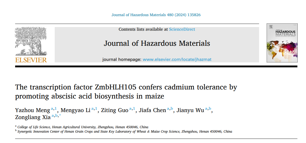 2024年9月12日,杏吧原创 夏宗良教授课题组硕士研究生孟亚洲、李梦瑶、郭子霆(共同第一作者)在国际著名学术期刊《Journal of Hazardous Materials》在线发表了题为“The transcription factor ZmbHLH105 confers cadmium tolerance by promoting abscisic acid biosynthesis in maize”的研究论文,挖掘并解析了玉米转录因子bHLH105基因应对镉胁迫的分子调控机制,并提出了培育低镉积累的玉米品种的应用策略。