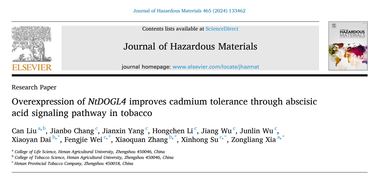 2024年1月9日,杏吧原创 夏宗良教授课题组硕士研究生刘灿(第一作者)在国际著名学术期刊《Journal of Hazardous Materials》在线发表了题为“Overexpression of NtDOGL4 improves cadmium tolerance through abscisic acid signaling pathway in tobacco”的研究论文,解析了烟草抗逆基因NtDOGL4应对镉胁迫的分子调控机制,为培育低镉积累的烟草品种提供了理论基础和技术支撑。