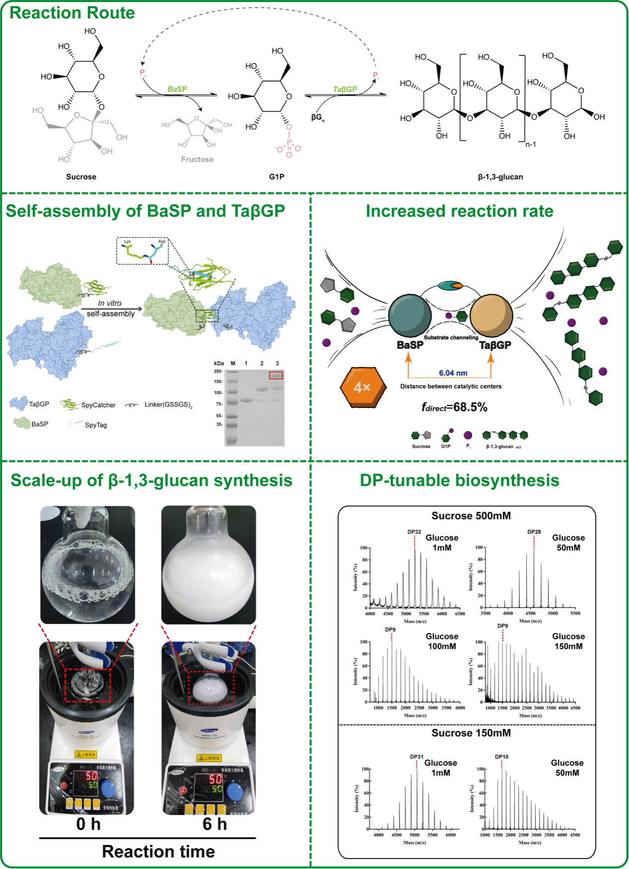 宋安东教授团队在Carbohydrate Polymers期刊在线发表了题为“One-pot tailored synthesis of highly monodisperse β-1,3-glucan from sucrose driven by an in vitro self-assembled dual-enzyme system via spy chemistry”的研究论文,利用SpyCatcher/SpyTag生物正交点击化学技术构建了β-1,3-葡聚糖自组装双酶合成体系,实现了单分散性优异、聚合度可调β-1,3-葡聚糖的绿色、经济、高效合成。