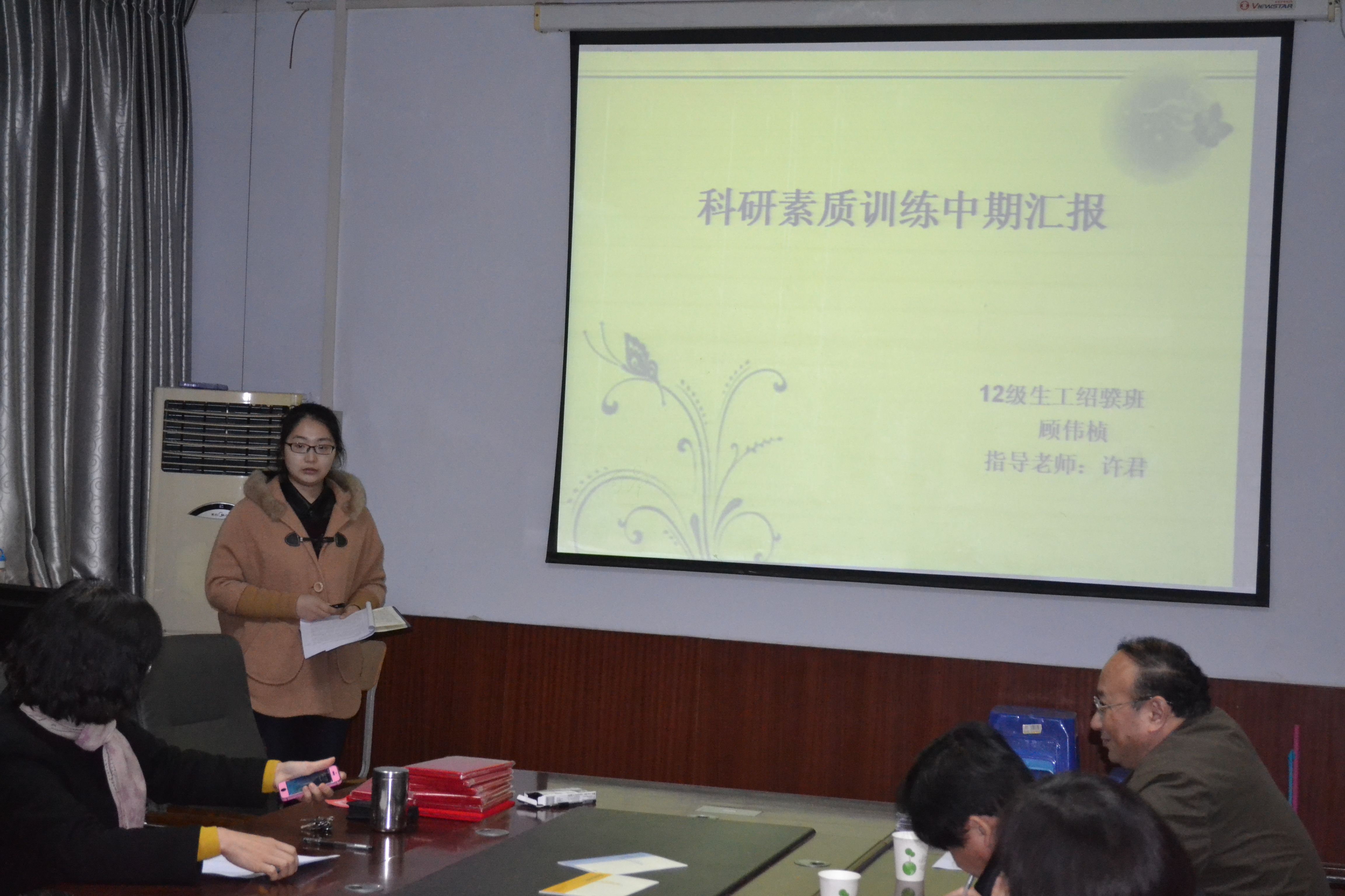 科研素质训练中期考核要求2012级绍骙实验班学生事先填写“科研素质训练中期检查报告”,然后PPT现场汇报其参与的科研工作,评委提问并打分。最终评出8位科研素质训练成绩优秀的同学予以表彰奖励。