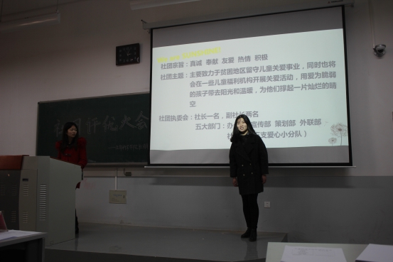 此次社团评优大会共有兰梅斋、生命志愿者协会、sunshine社团、viva la vida足球社、飞音社团、爱心家教社团六个社团参加评选。在评优大会上每个社团代表从自己所在的社团内部情况、社团活动及社团发展等几个方面做了精彩生动的介绍,使我们感受到了杏吧原创