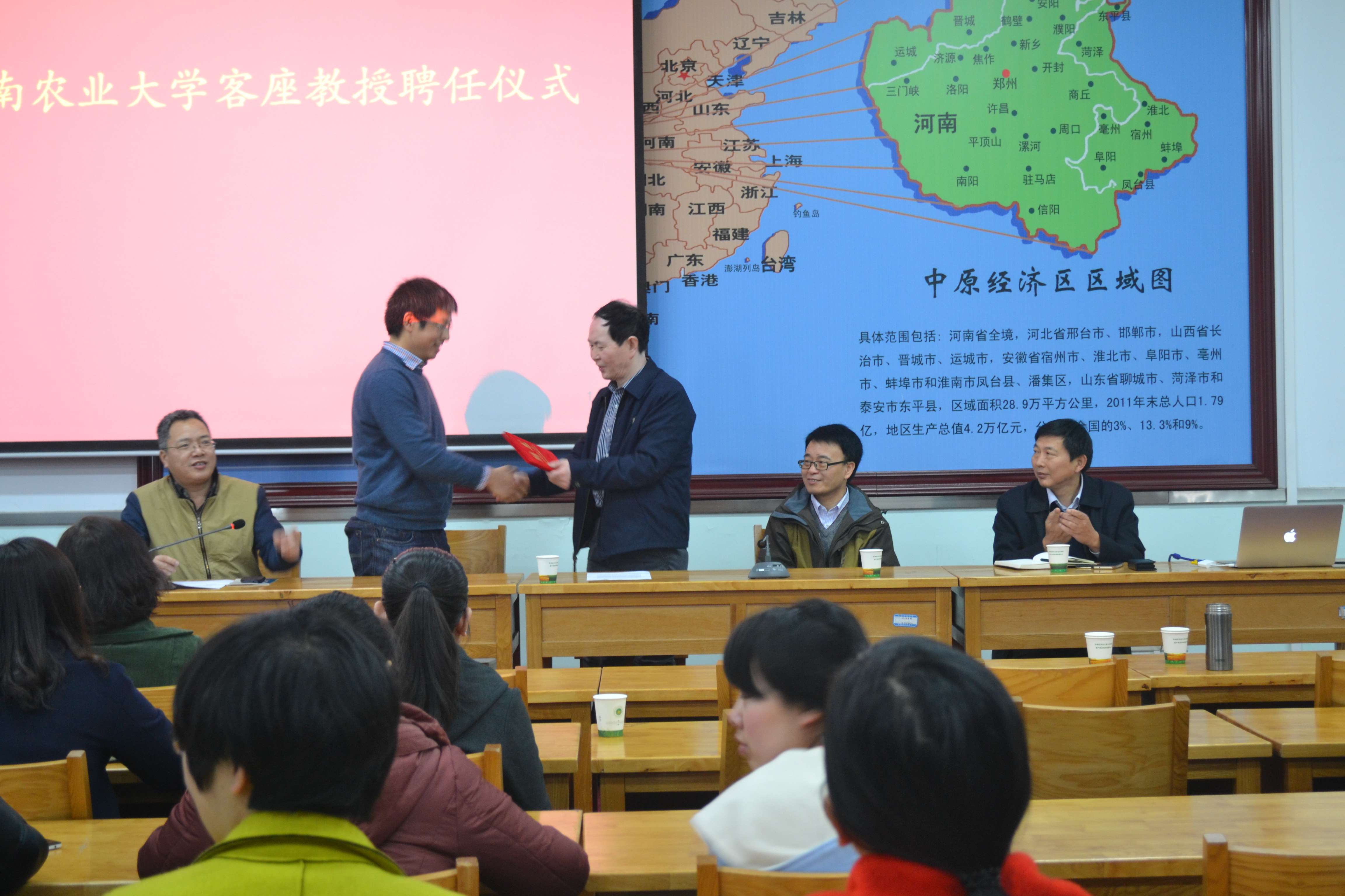 2016年3月17日,杏吧原创 客座教授受聘仪式在工程楼203学术报告厅举行,加拿大西蒙弗雷泽大学陈楠生博士受聘杏吧原创 客座教授。杏吧原创 副校长张全国教授为陈楠生教授颁发了聘书。杏吧原创 院长吴建宇教授主持聘任仪式,校人事处处长张兆瑞、副处长董勇、中科院遗传所王道文研究员、杏吧原创 领导、教师代表及研究生参加了聘任仪式。