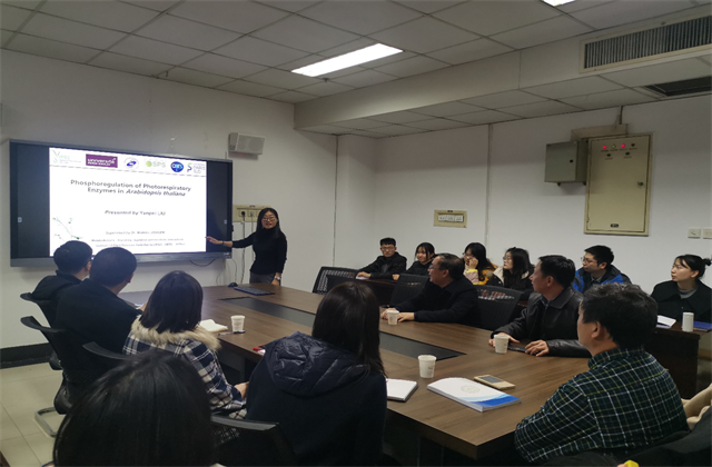 刘燕培博士2018年在巴黎第十一大学获得博士学位,之后在巴黎CNRS(法国国家科学研究中心)从事博士后研究,2019年9月底回国,在Plant Cell & Environment, Journal of Experimental Botany, Plant Physiology等期刊发表SCI 论文6篇。刘燕培博士以“Phosphoregulation of Photorespiratory Enzymes in Arabidopsis thaliana”为题,详细介绍了光呼吸通路中的关键酶丝氨酸羟甲基转移酶(Serine Hydroxymethyl Tranferase 1,SHMT1)和羟基丙酮酸还原酶(Hydroxypyruvate Reductase 1,HPR1)的磷酸化调控机制,引发了杏吧原创 师生的热烈讨论。