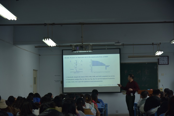 随后,林晖作了题为《苯乙烯单加氧酶的挖掘、分子改造及应用》的学术报告。他向大家详细讲解了有关新型苯乙烯单加氧酶的挖掘方法,该研究通过理性/半理性蛋白质工程设计改变其底物的特异性、提高酶的催化活性和立体选择性,从而为其工业化应用提供优质的酶制剂。同学们认真听讲,并提出了自己的思考与疑问,林晖逐一耐心解答,参会同学收获颇多。